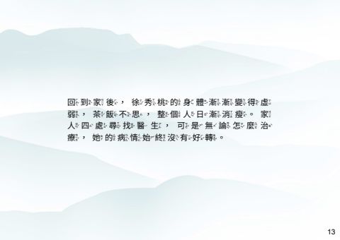 %u56de%u5230%u5bb6%u5f8c%uff0c%u5f90%u79c0%u6843%u7684%u8eab%u9ad4%u6f38%u6f38%u8b8a%u5f97%u865b%u5f31%uff0c%u8336%u98ef%u4e0d%u601d%uff0c%u6574%u500b%u4eba%u65e5%u6f38%u6d88%u7626%u3002%u5bb6%u4eba %u56db %u8655 %u5c0b %u627e %u91ab %u751f%uff0c %u53ef %u662f %u7121 %u8ad6 %u600e %u9ebc %u6cbb%u7642%uff0c%u5979%u7684%u75c5%u60c5%u59cb%u7d42%u6c92%u6709%u597d%u8f49%u300213