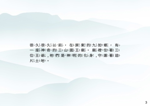 %u5f88%u4e45%u5f88%u4e45%u4ee5%u524d%uff0c%u5728%u5c4f%u6771%u7684%u4e5d%u5982%u9109%uff0c%u6709%u4e00%u5ea7%u795e%u5947%u7684%u4e09%u5c71%u570b%u738b%u5edf%u3002%u5edf%u88e1%u4f4f%u8457%u4e09%u4f4d%u738b%u723a , %u7942%u5011%u662f%u795e%u660e%u7684%u5316%u8eab , %u5b88%u8b77%u8457%u9019%u7247%u571f%u5730%u30023