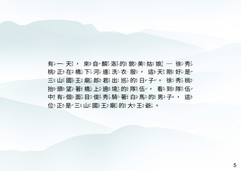 %u6709%u4e00%u5929%uff0c%u4f86%u81ea%u9e9f%u6d1b%u7684%u8c8c%u7f8e%u59d1%u5a18 %u2500%u5f90%u79c0%u6843%u6b63%u5728%u6a4b%u4e0b%u6cb3%u908a%u6d17%u8863%u670d%uff0c%u9019%u5929%u525b%u597d%u662f%u4e09%u5c71%u570b%u738b%u5edf%u90ce%u541b%u51fa%u5de1%u7684%u65e5%u5b50%u3002%u5f90%u79c0%u6843%u62ac%u982d%u671b%u8457%u6a4b%u4e0a%u9076%u5883%u7684%u968a%u4f0d%uff0c%u770b%u5230%u968a%u4f0d%u4e2d%u6709%u500b%u9762%u76ee%u4fca%u79c0%u9a0e%u8457%u767d%u99ac%u7684%u7537%u5b50%uff0c%u9019%u4f4d%u6b63%u662f%u4e09%u5c71%u570b%u738b%u5edf%u7684%u5927%u738b%u723a%u30025